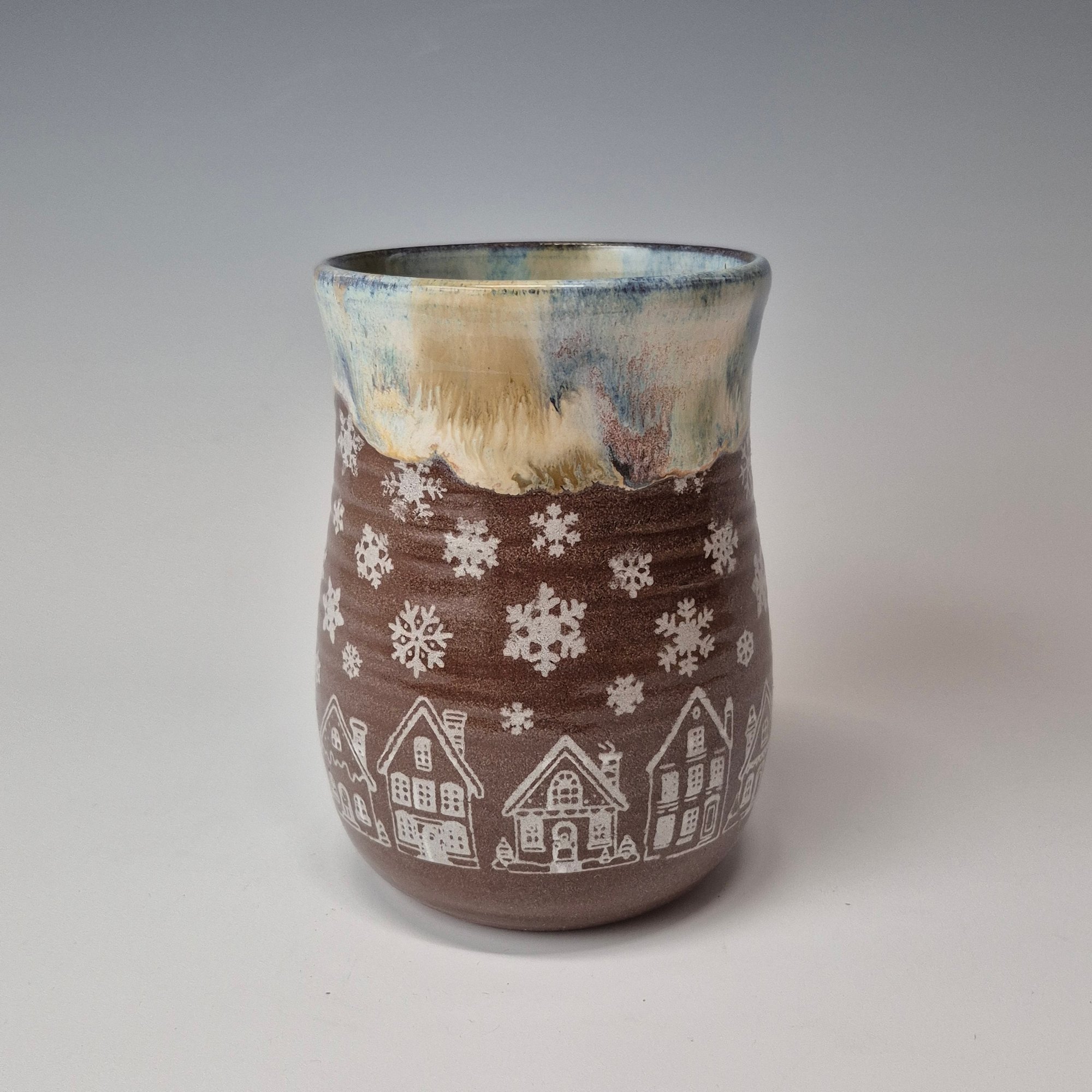 I love snowflakes for so many reasons and that admiration has gotten me to love and appreciate cold weather...Clusters of snowflakes nestled on holiday lights... the light's glow creating an aura of coziness along the string of bulbs. The rim glaze freezes in time that feeling of seasonal joy.