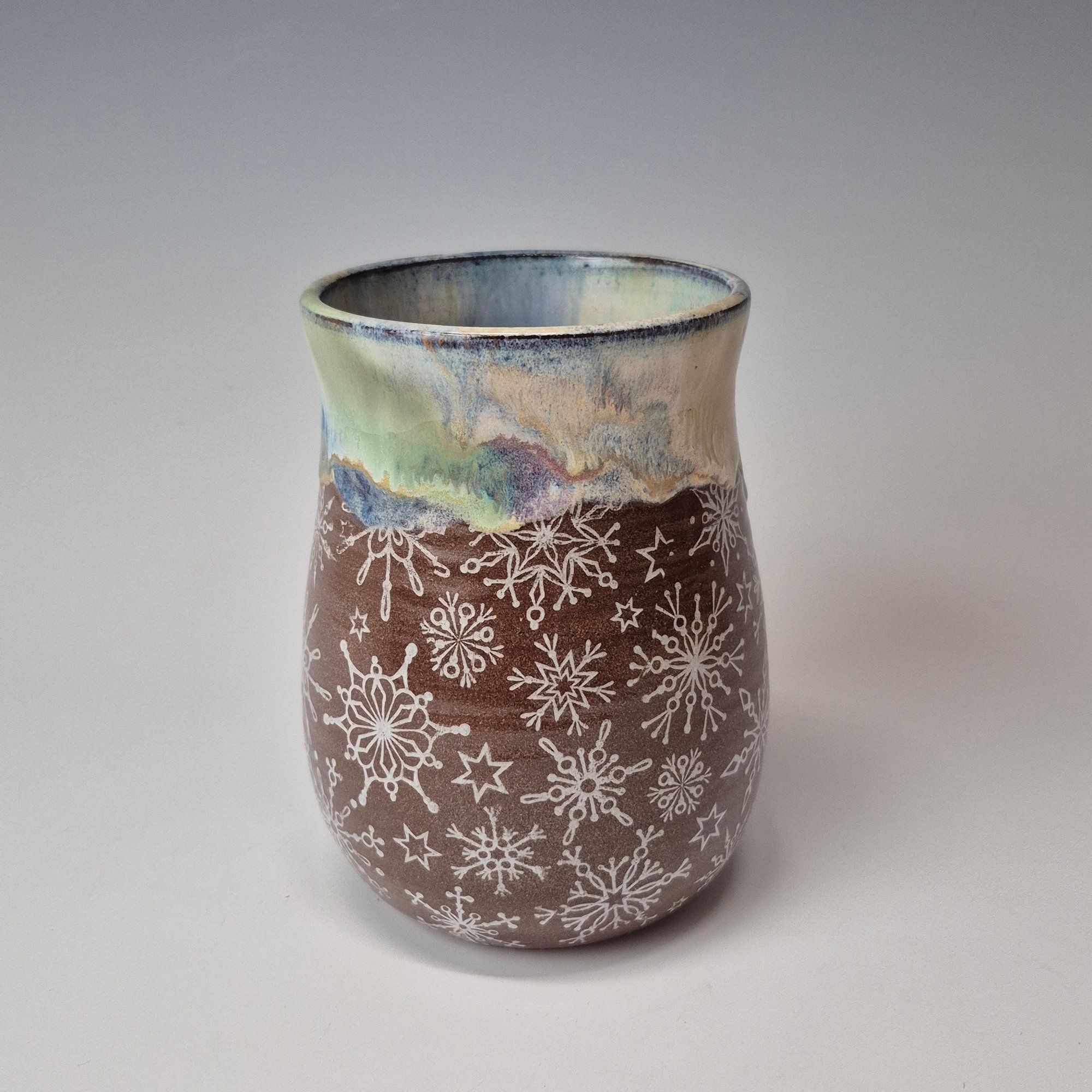 I love snowflakes for so many reasons and that admiration has gotten me to love and appreciate cold weather...Clusters of snowflakes nestled on holiday lights... the light's glow creating an aura of coziness along the string of bulbs. The rim glaze freezes in time that feeling of seasonal joy.
