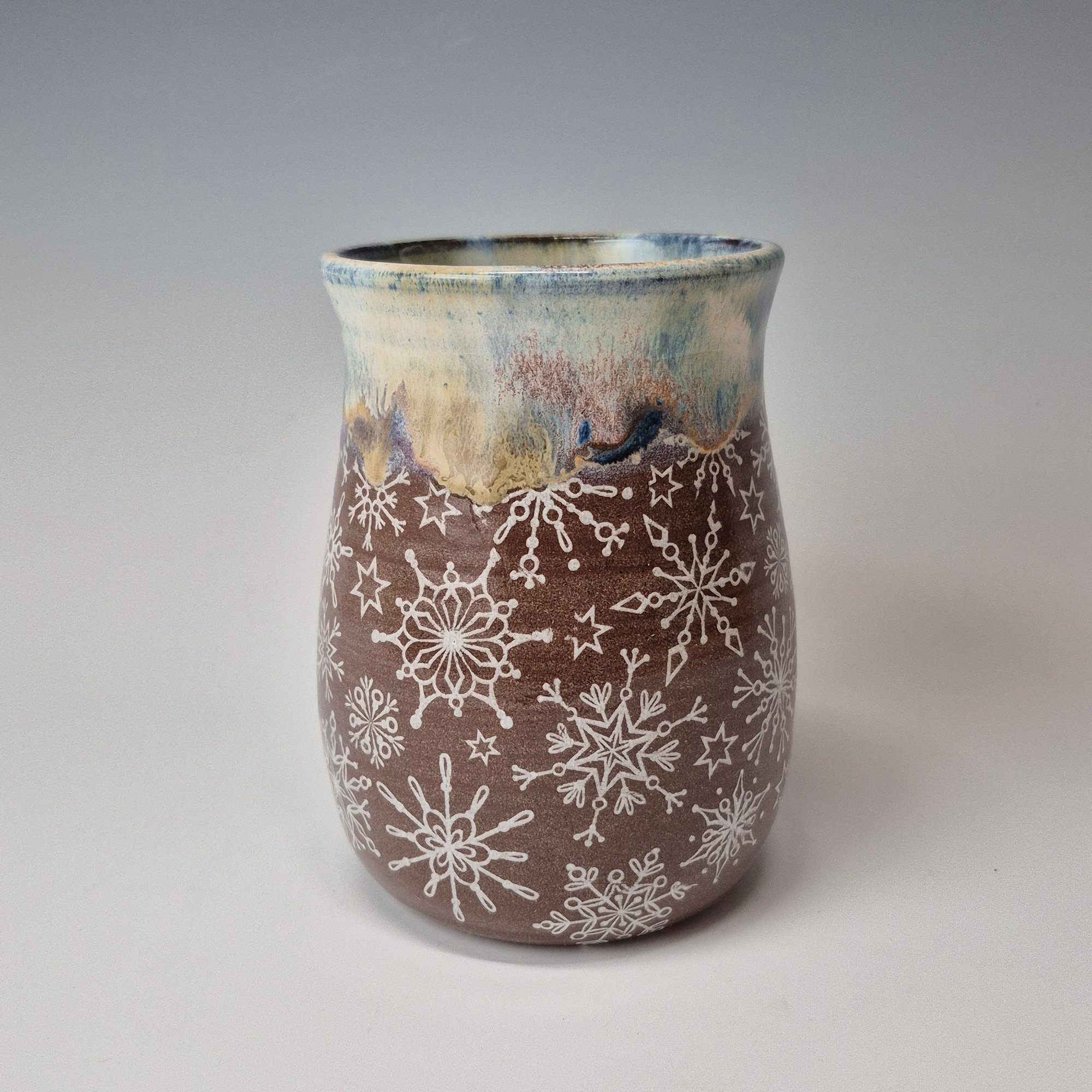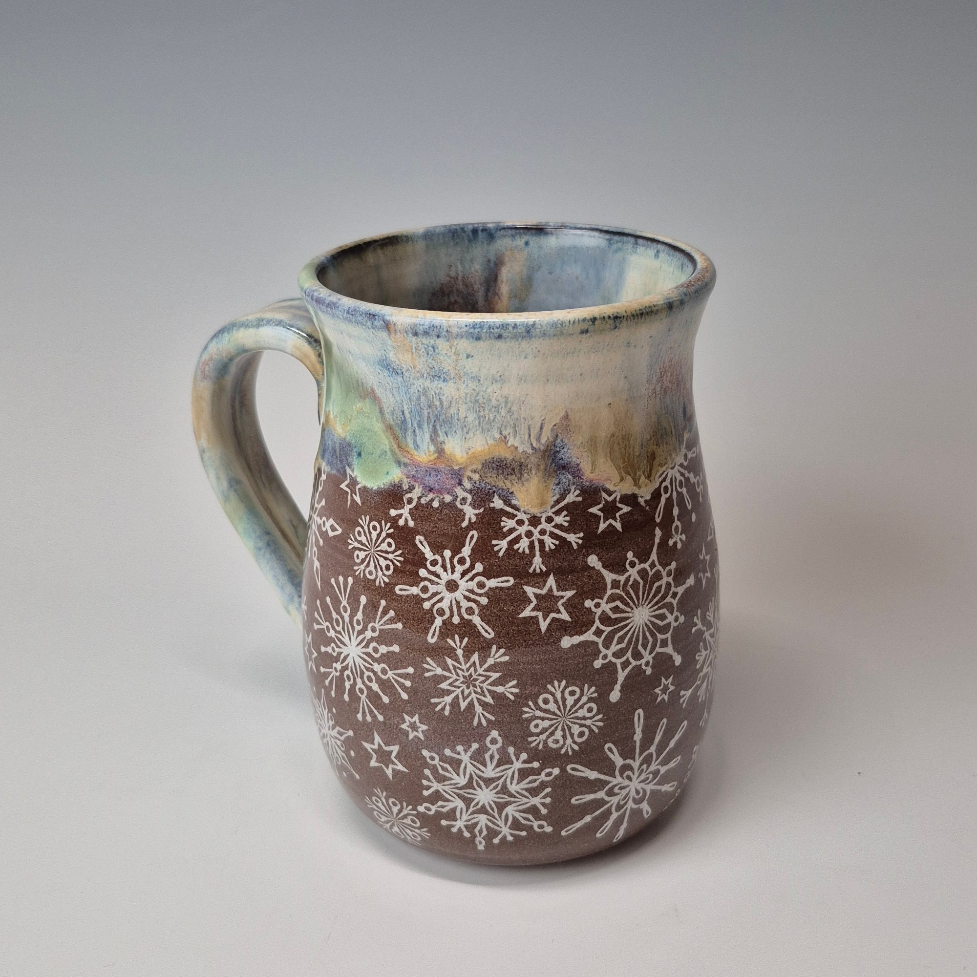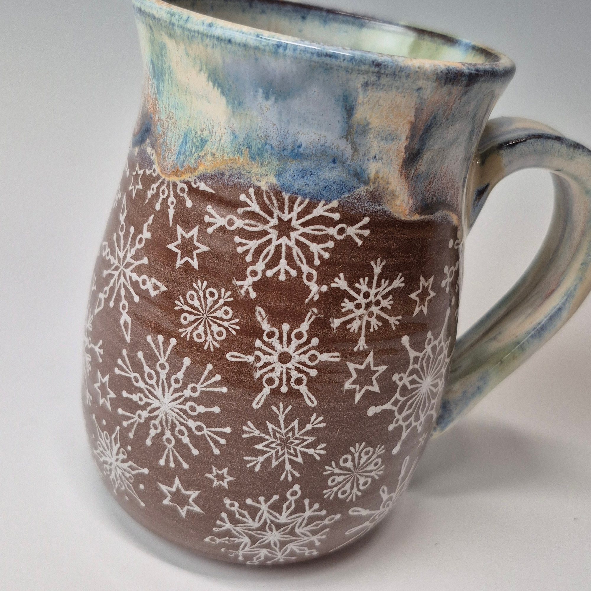 I love snowflakes for so many reasons and that admiration has gotten me to love and appreciate cold weather...Clusters of snowflakes nestled on holiday lights... the light's glow creating an aura of coziness along the string of bulbs. The rim glaze freezes in time that feeling of seasonal joy.