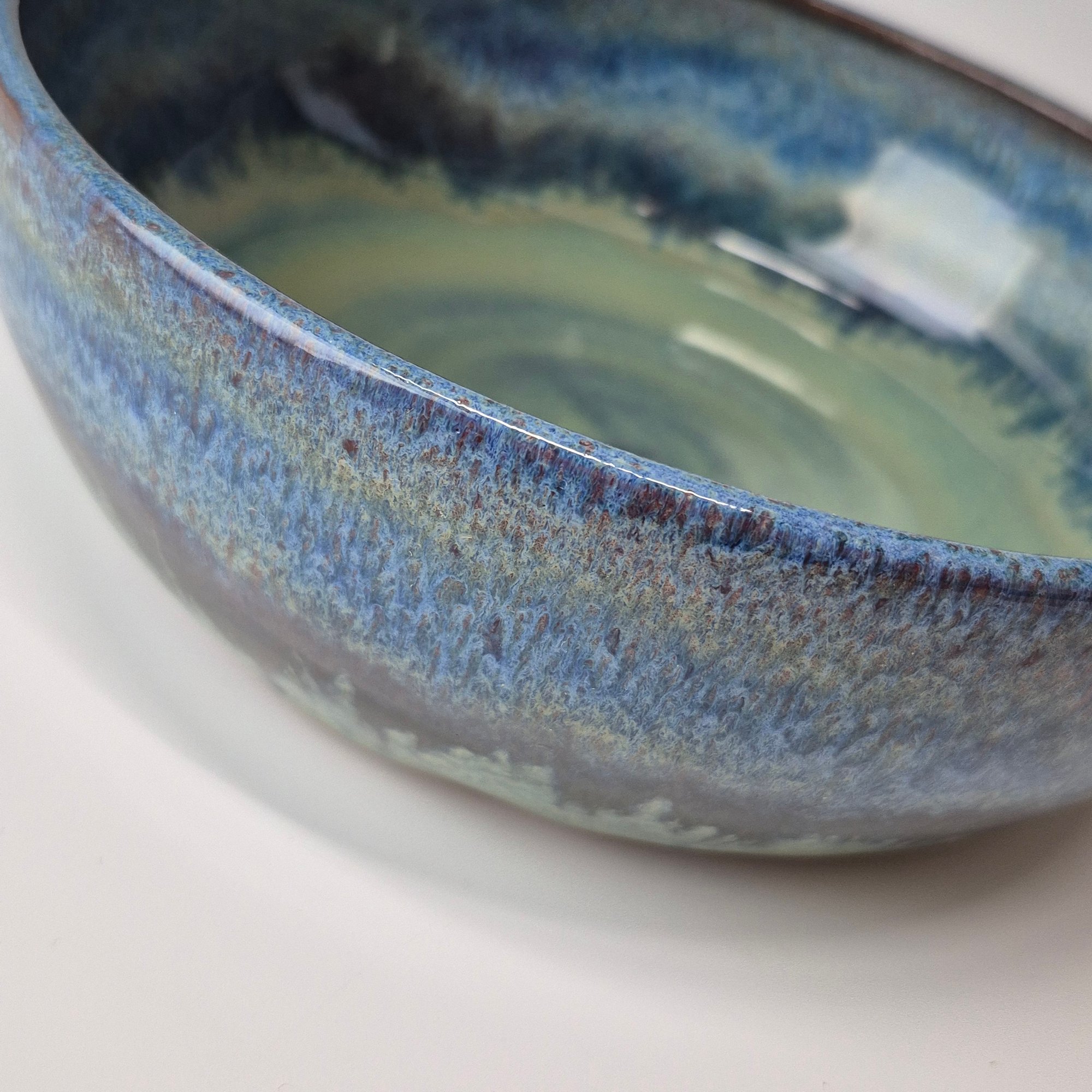 I create in small batches. Each piece is thrown in the likeness of the next, hand-crafted, and with hand-brushed glazing. I hope you’ll agree variations in color, small marks from the minerals and stone in the clay, or slight sways in design resulting from working with natural materials create the charm expected and treasured in handmade pottery.