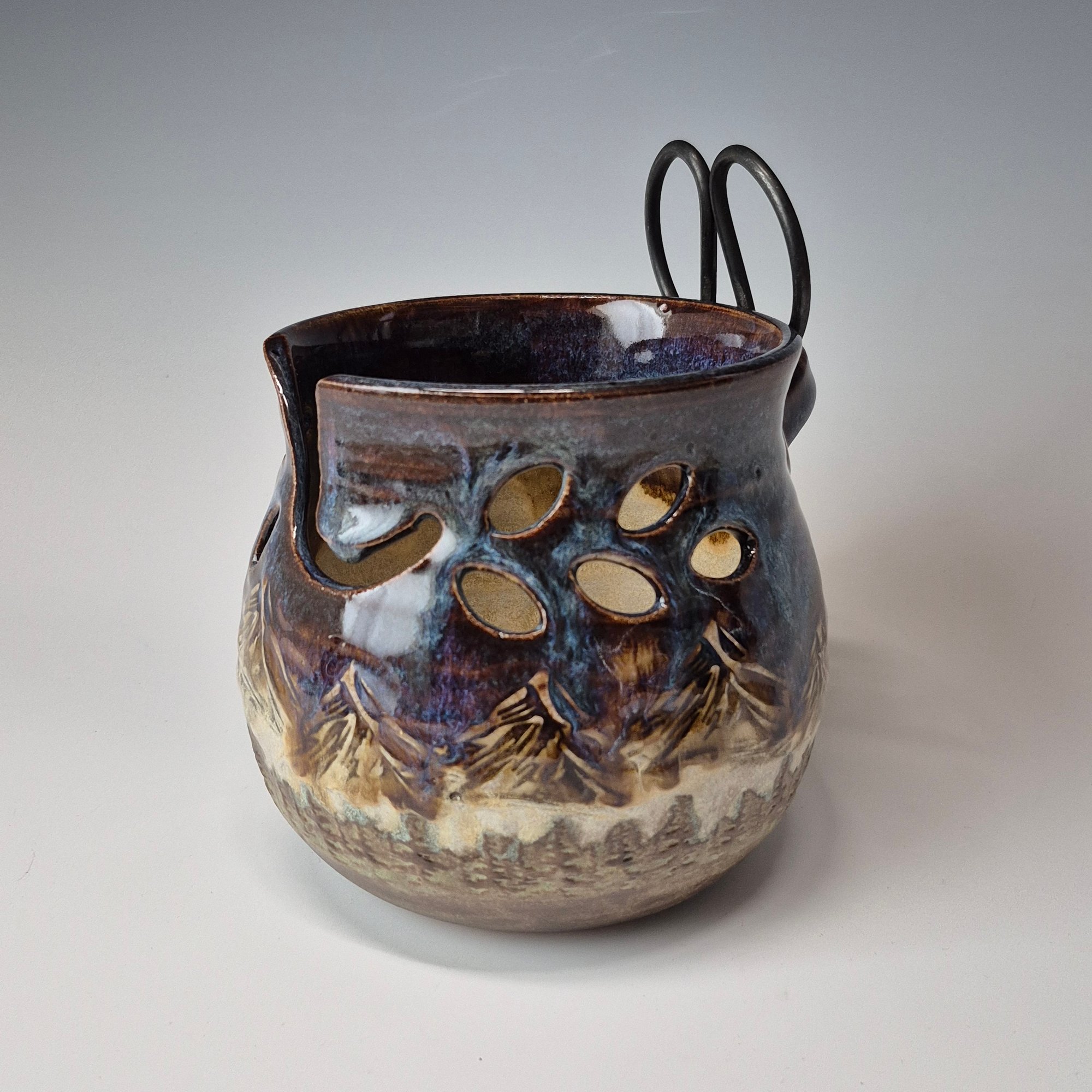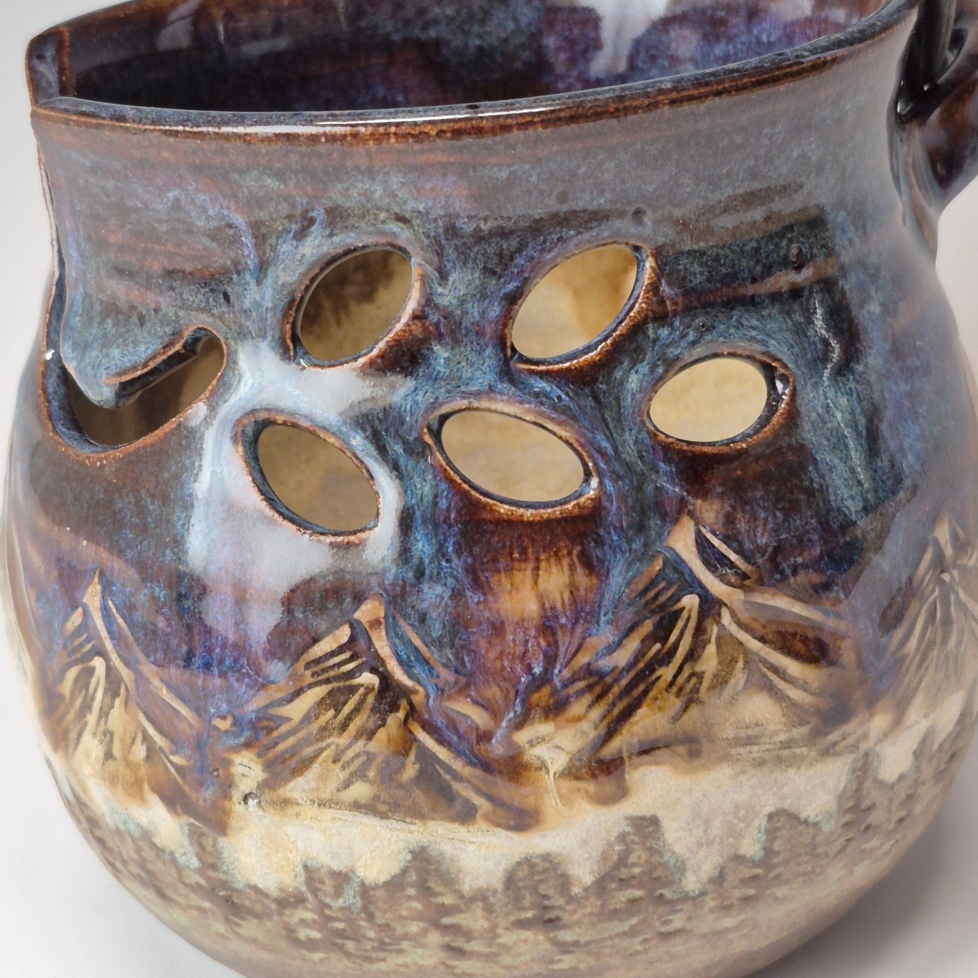 Hand-thrown and hand-signed using durable and functional brown stoneware clay produced in Montana. Each pot is hand-brushed with at least 6 coats of glazing, ensuring a thick blanket of glass for long-time use.